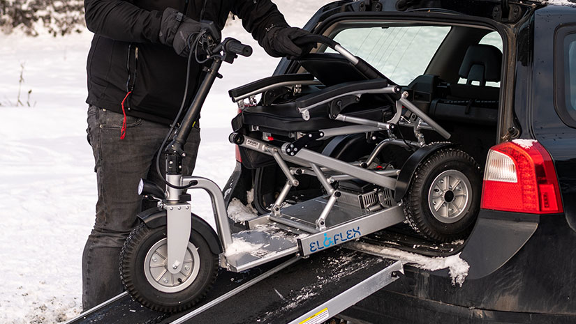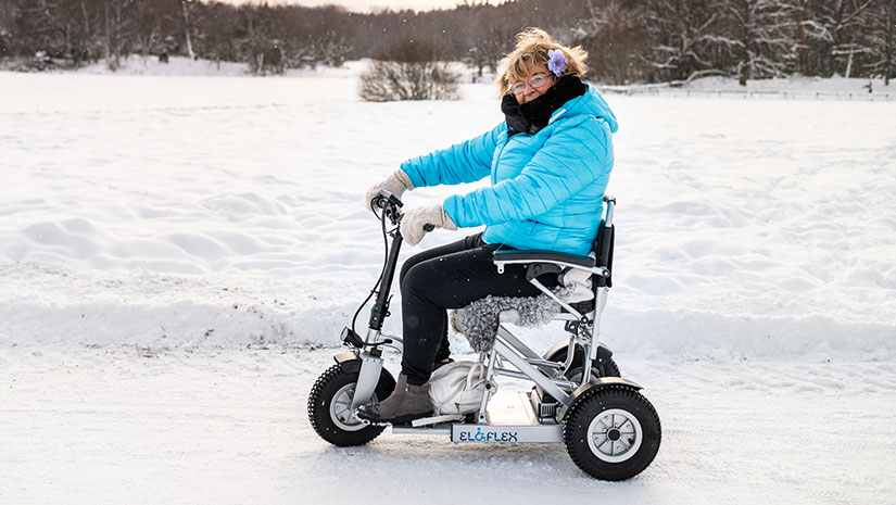 Con il scooter ibrido Eloflex si ottiene il meglio: un ausilio leggero e facile da portare con sé, ma al contempo robusto per affrontare avventure all'aria aperta in ambienti difficili. Eloflex S1 è costruito per resistere a tutte le stagioni, compresi i rigidi inverni nordici, ed è quindi una scelta di mobilità versatile e affidabile durante tutto l'anno.